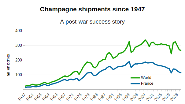 To put the recent slowdown in context, Champagne has been a massive post-World War 2 success story for the French wine industry. In 1960, Champagne shipped around 49 million bottles, of which more than two thirds stayed at home. Shipments had doubled by 1970 to 102 million bottles and had doubled again by 1986, boosted by rising domestic consumption and a growing export share.