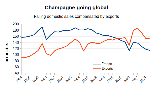 The number of exported bottles caught up with domestic Champagne shipments in 2017, and hasn’t dropped below local consumption since.